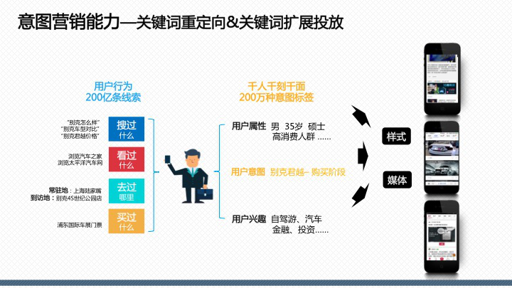 百度百意:提供品效合一的跨屏、全能、程序化投放服務囊括60萬家網站、app聯盟資源,橫跨PC、移動、交通、電視多屏呈現,整合多維精準定向能力,千人千面時代,目標客戶咫尺觸達。